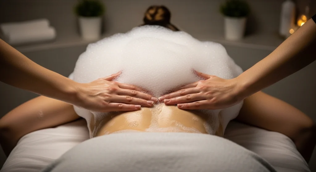 - Bubble Therapy Application Warm, light bubbles are applied to the body, creating a smooth and gliding surface that reduces friction and enhances massage flow.